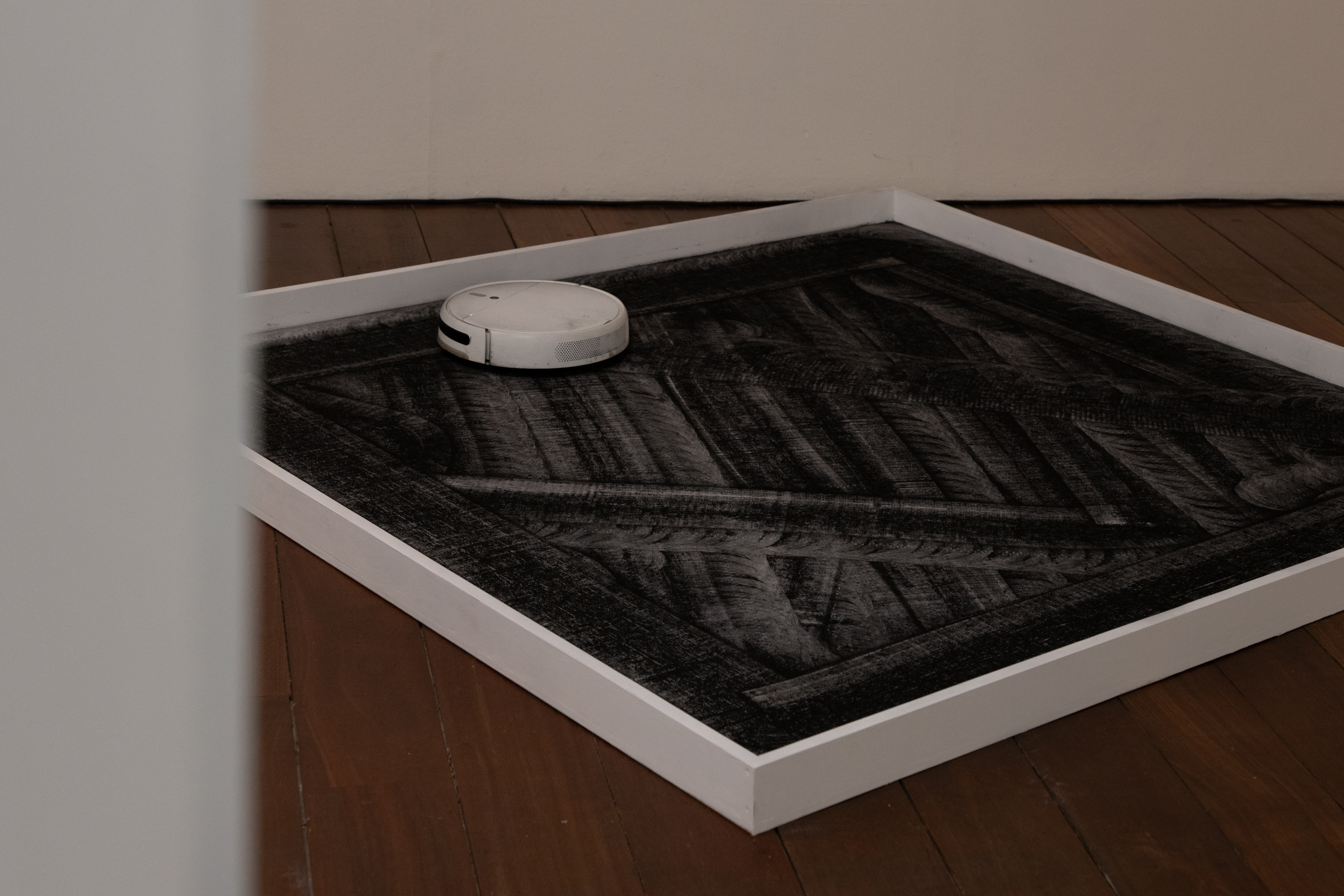 As it clears away black charcoal powder the artist has placed on the floor, the robot spreads the powder cleaning in a Sisyphean task of seemingly meaningless but beautiful labor. do{}while() invites a mutual recognition of the subject position of the worker between the human viewer and the machine.